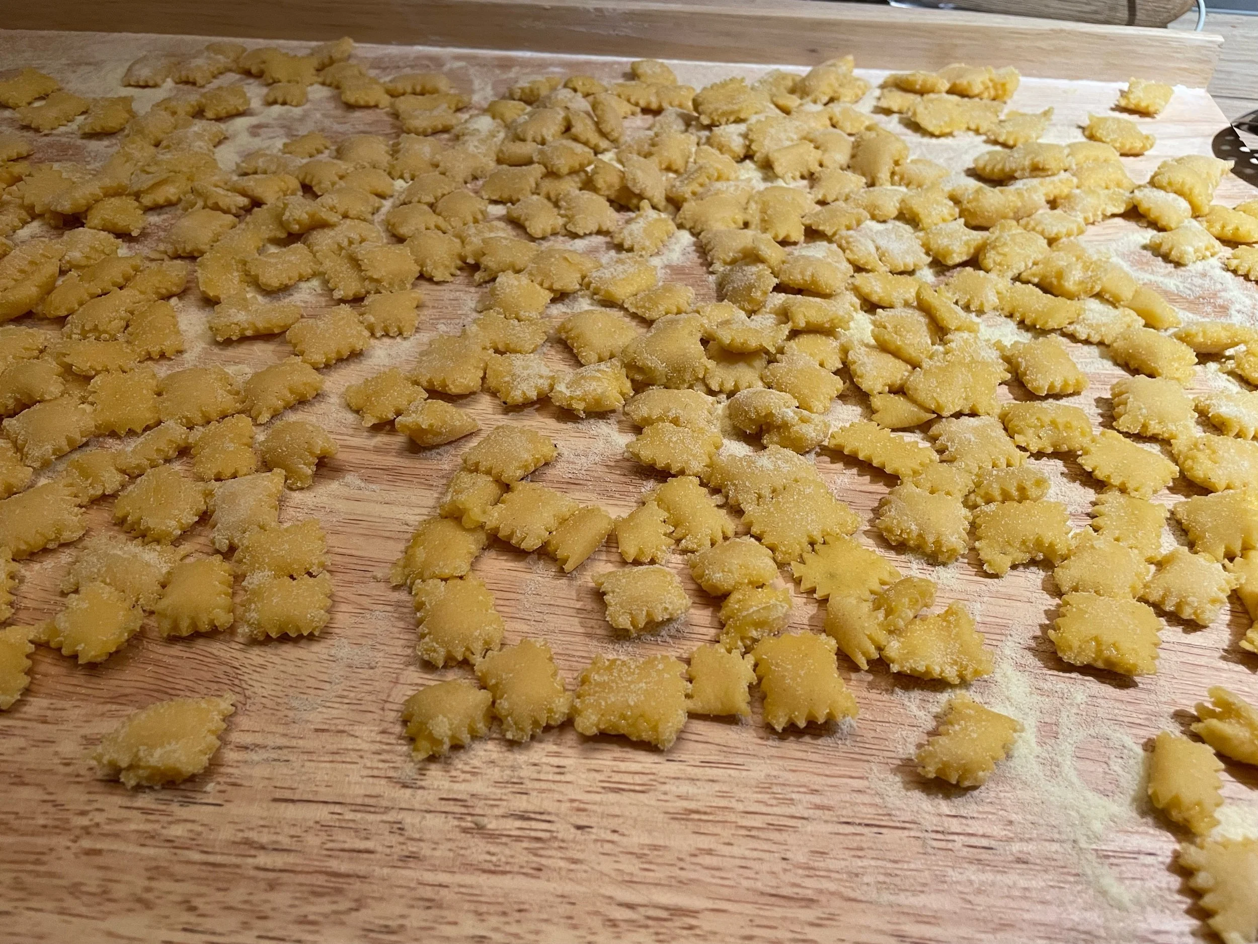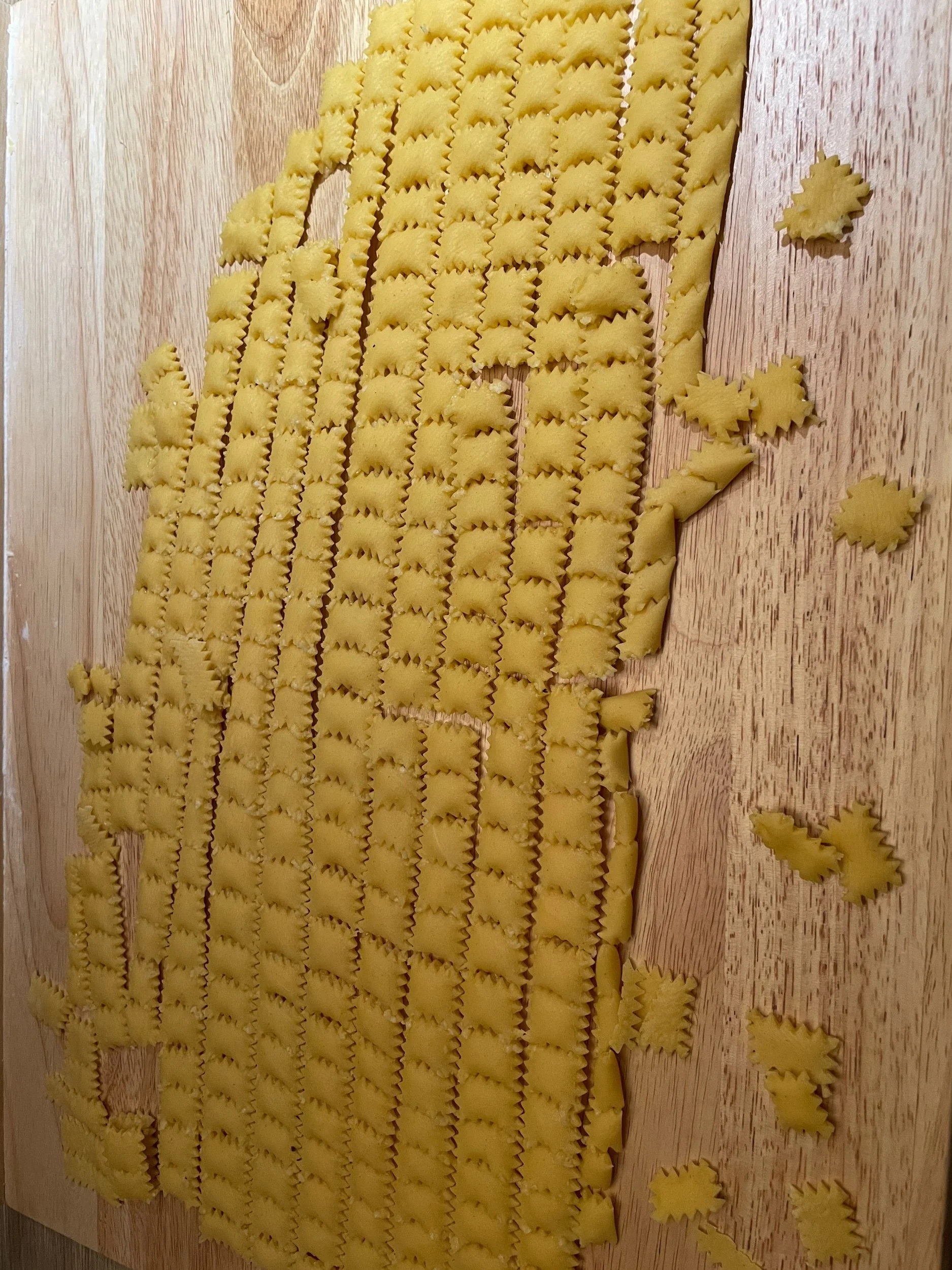 Den Teig so dünn ausrollen, das er durchscheinend dünn ist. Dies geht mit einiger Übung am besten per Hand. Alternativ mit der Nudelmaschine dünne Bahnen ausrollen. Die Füllung auf einer Hälfte der Teigbahn verteilen und die andere Hälfte darüberlegen. Mit dem Nudelholz leicht anrollen und anschließend mit dem Pastorat kleine Rechtecke abrollen.
