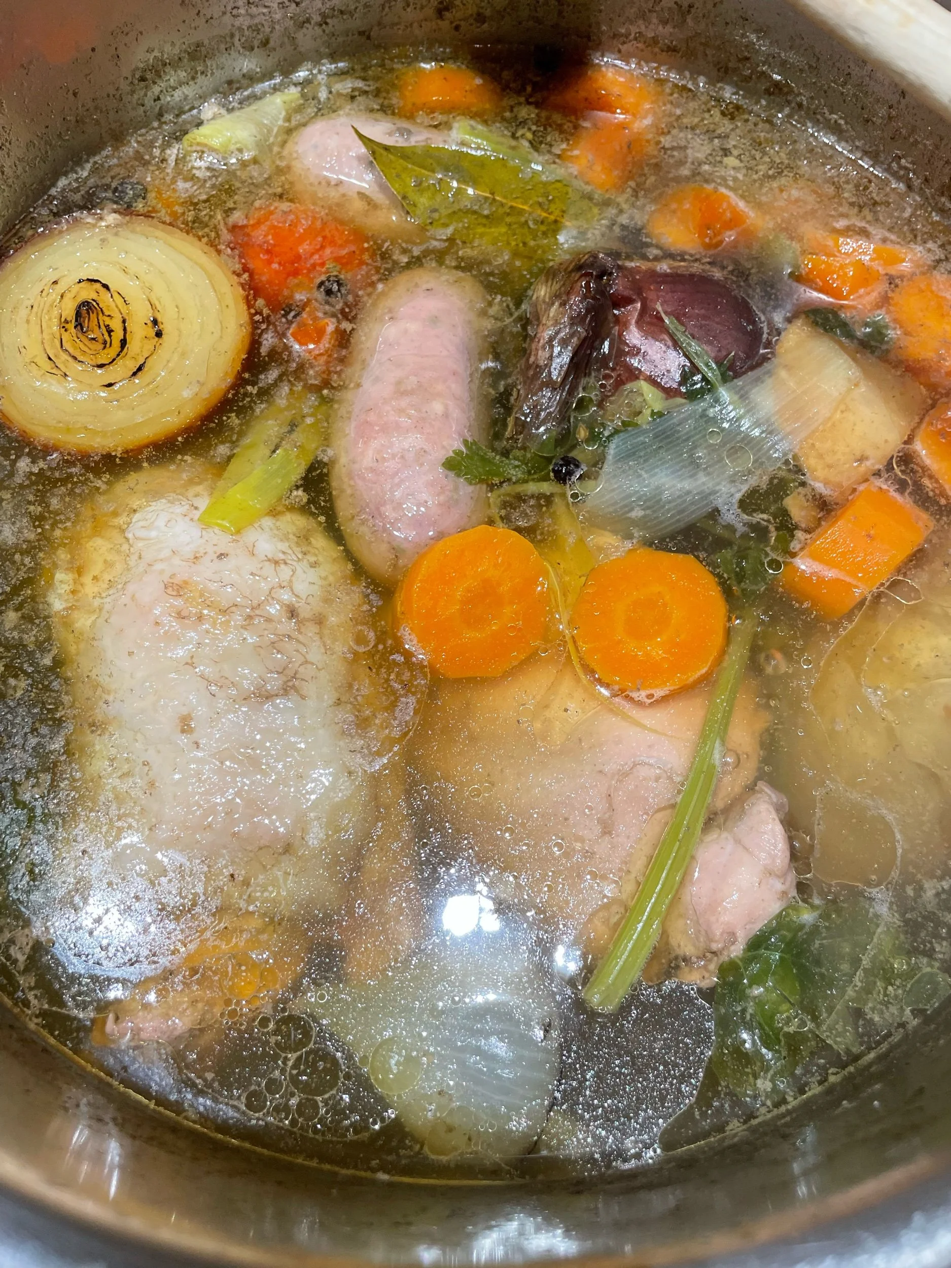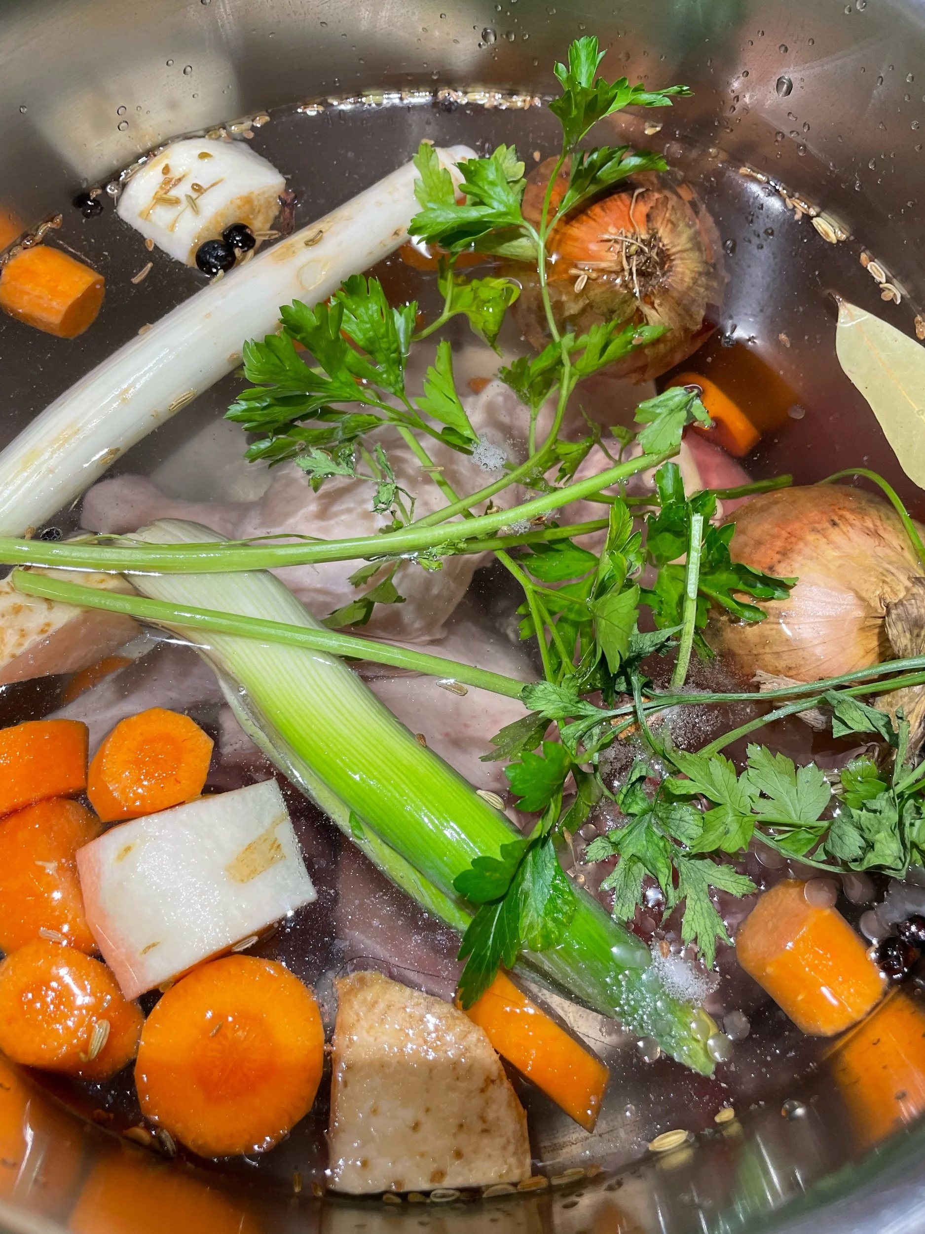 Eine Brühe ansetzen. Die Zwiebel halbieren und auf den Schnittflächen rösten. Die Fleischstücke ggfs kurz abbrausen, das Gemüse putzen, würfeln. Alles in einen großen Topf geben, Gewürze hinzufügen und mit kaltem Wasser ansetzen. Aufkochen, dabei abschäumen. Danach leicht simmernd (max 85° C) für gut 3 Stunden vor sich hinköcheln lassen.