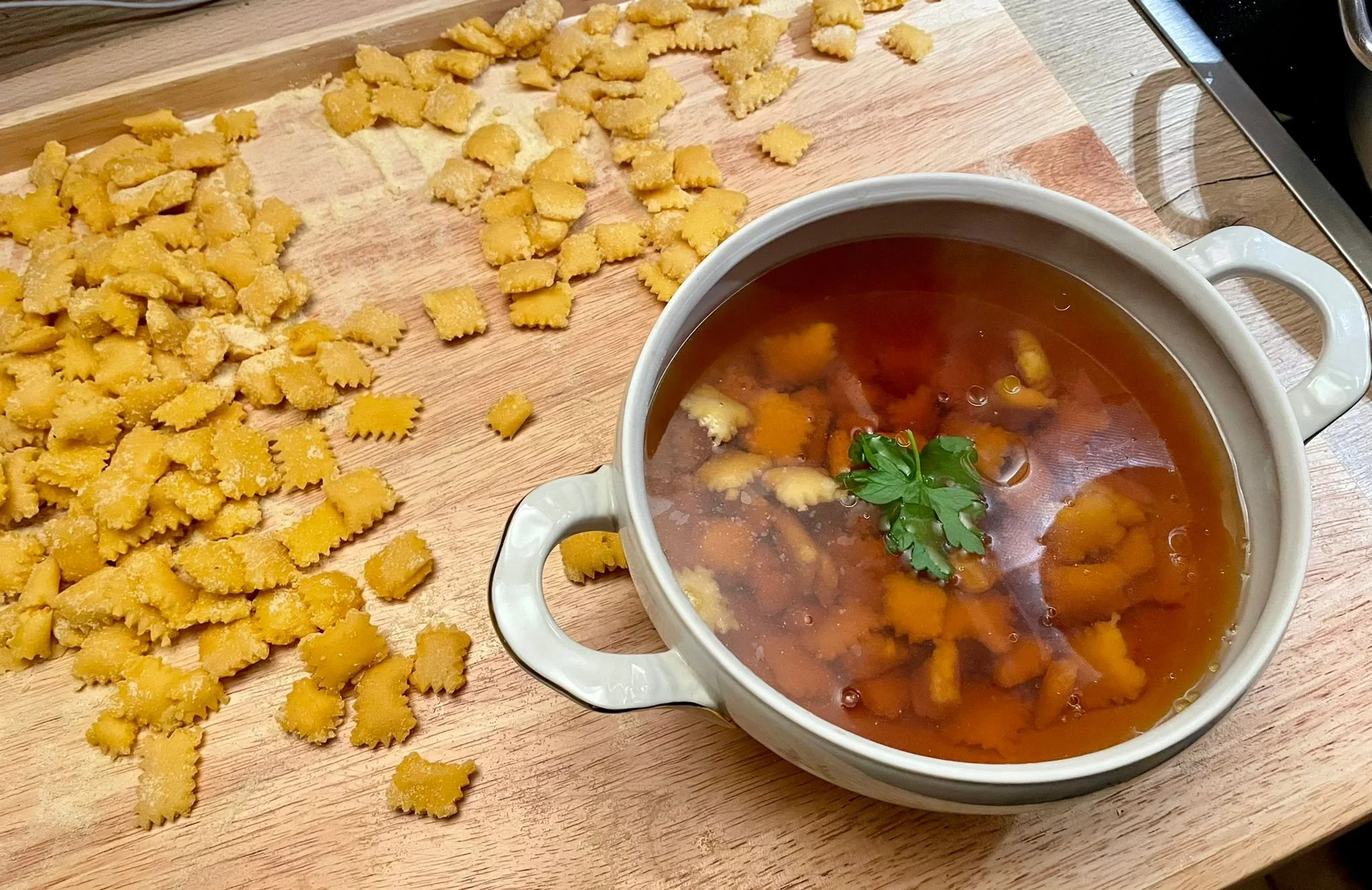 Zuerst isst man die Suppe (brodo auf italienisch) mit den Sfoglia Lorda. Man kann diese direkt in der Suppe köcheln, ich präferiere sie separat in gesalzenem Wasser zu kochen, da andernfalls die Suppe leicht trüb werden kann. Die Kochzeit der Paste beträgt ca 2-3 Minuten, je nachdem wie lange vorher sie antrocknen konnte.