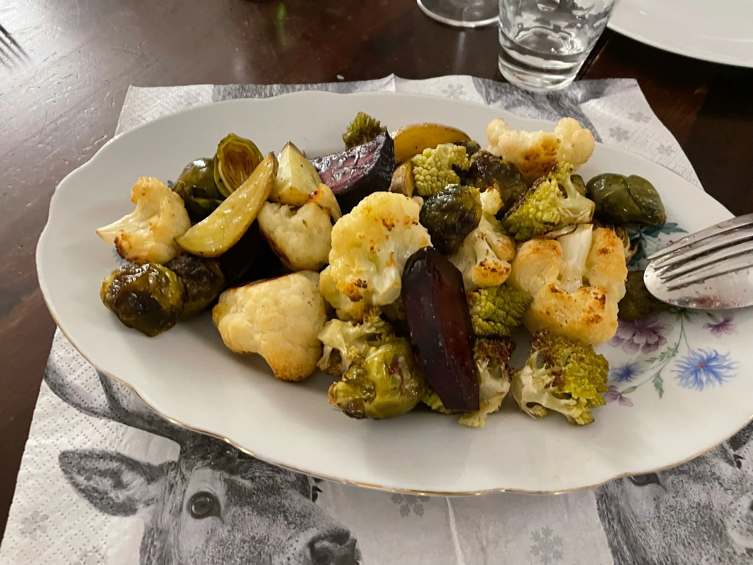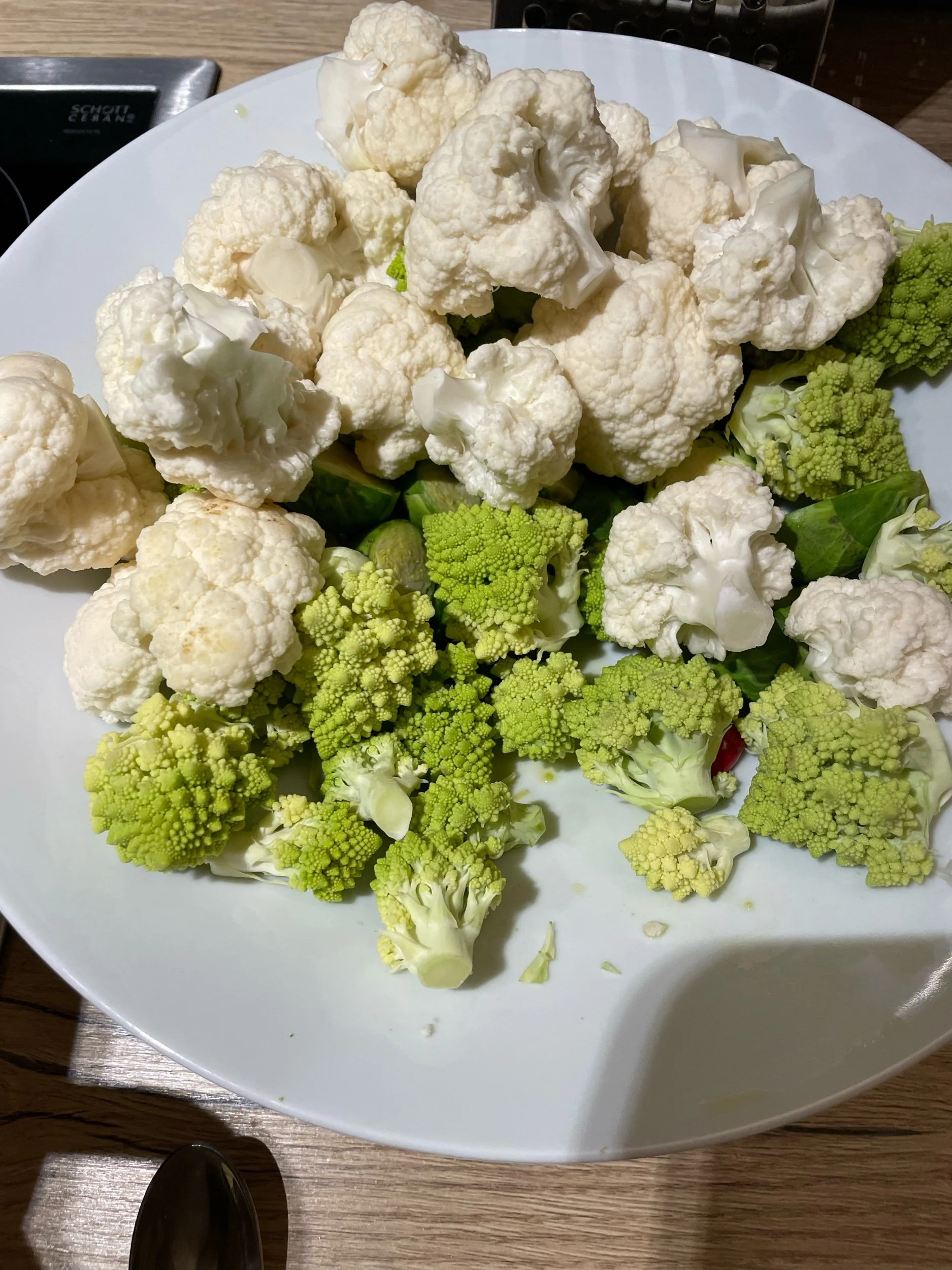 Saisonales Ofengemüse (in dem Fall nahm ich Blumenkohl, Romanesco, Kartoffeln, rote Bete & Rosenkohl).