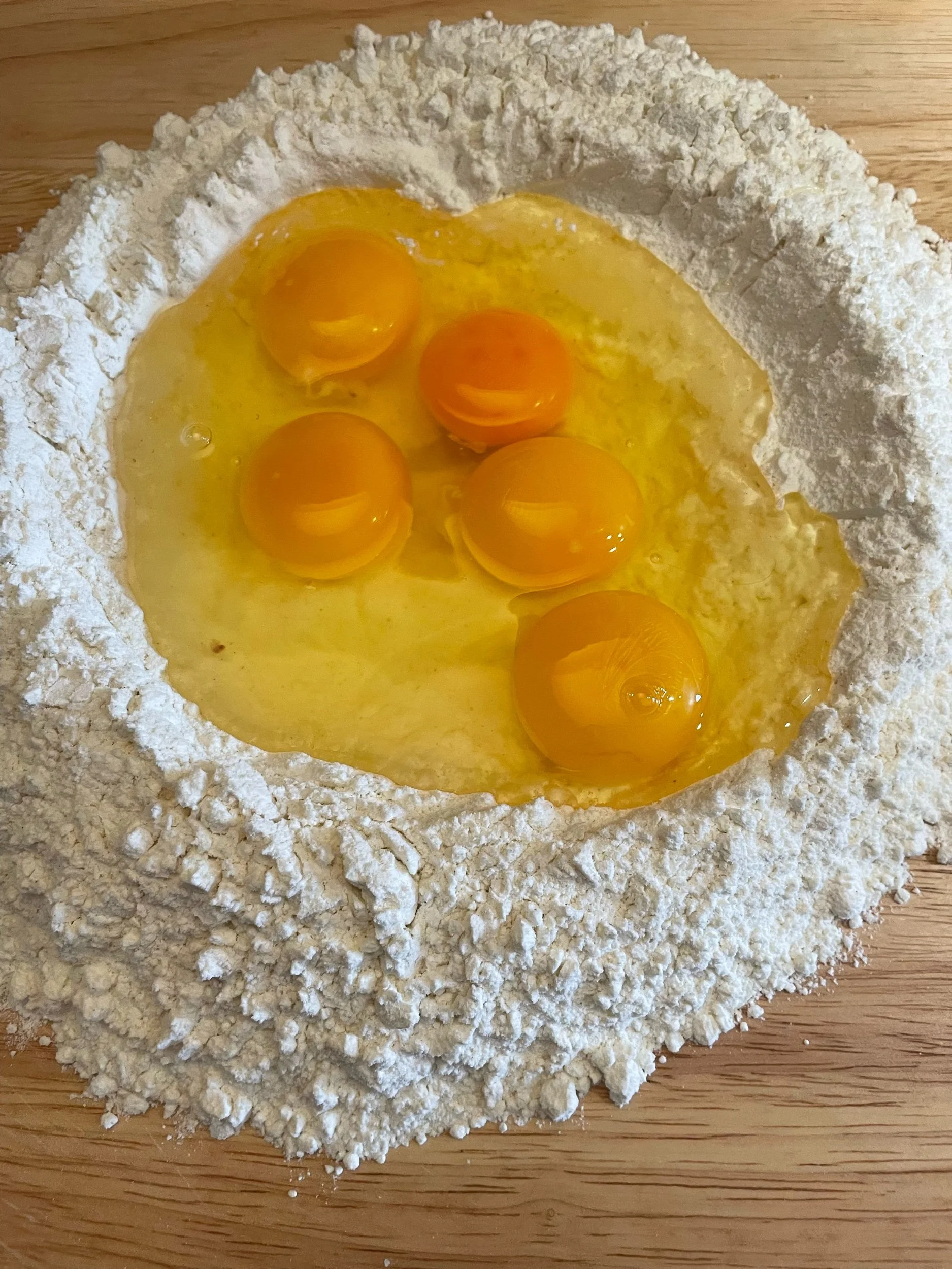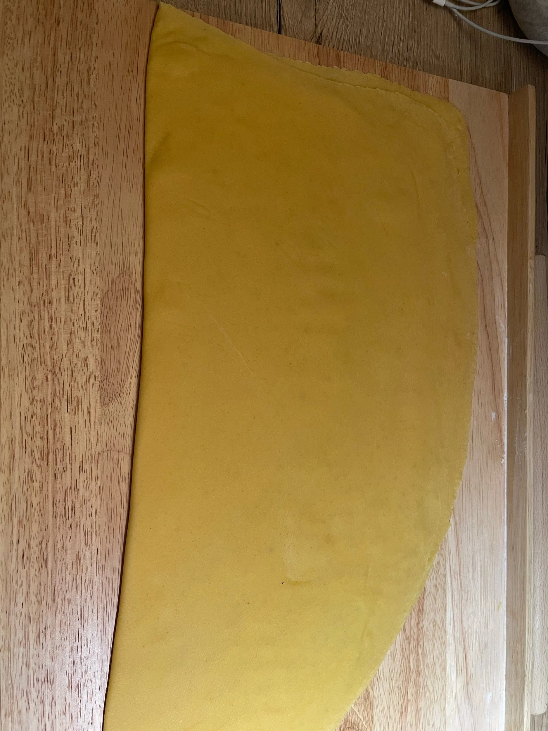 Aus dem Mehl und den Eiern einen Nudelteig kneten. Dies entweder mit der Küchenmaschine oder per Hand (meine Empfehlung). Per Hand das Mehl auf die Arbeitsfläche geben, eine Mulde formen und dort hinein die 4 Eier schlagen. Faustformel bei Nudelteig: 1 Ei pro 100 gr Mehl. Mit einer Gabel die Eimasse verquirlen und dann nach und nach das Mehl einarbeiten, dabei darauf achten, dass der Ring nicht gebrochen wird. Sobald ein klebriger Teig entstanden ist, diesen kräftig mit beiden Händen mindestens 10 Minuten kneten. Danach zu einer Kugel formen, in Frischhaltefolie einschlagen und für mindestens 30 Minuten im Kühlschrank ruhen lassen.