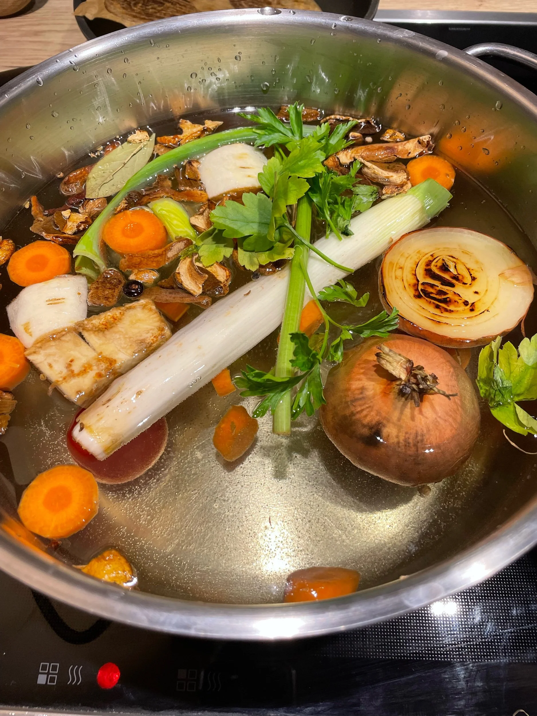 für die vegetarische Version: alle Zutaten von oben, ohne das Fleisch, dafür zusätzlich getrocknete Steinpilze, Tomate & Parmesanrinde (von den Sfoglia lorda)