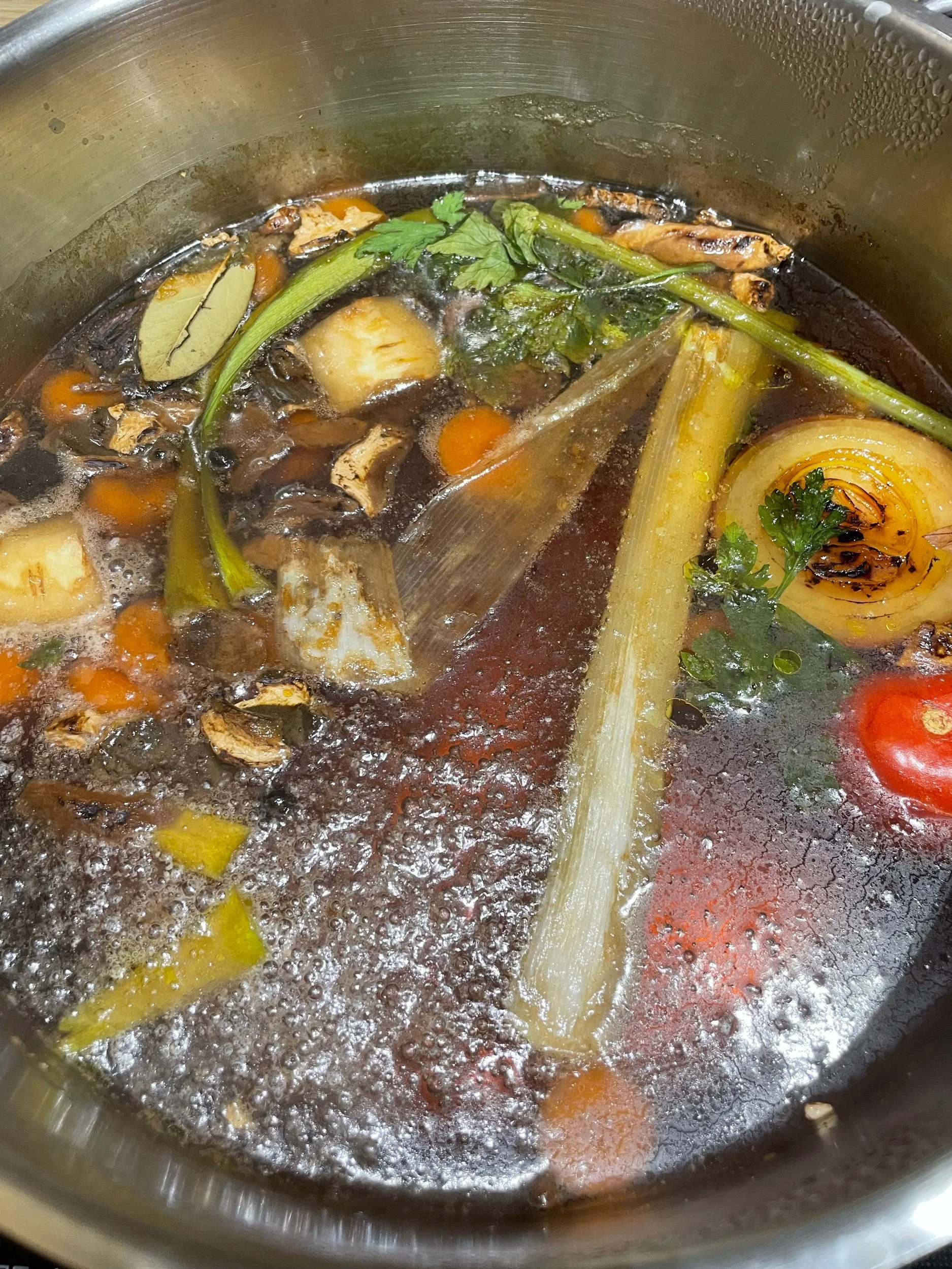 Aufgrund der Tatsache, dass wir einen Vegetarier am Tisch hatten und weil wir insgesamt nicht so viele waren, habe ich eine zweite Brühe angesetzt und die Mengen an Fleisch insgesamt reduziert. Zusätzlich gab es noch ein saisonales Ofengemüse.
